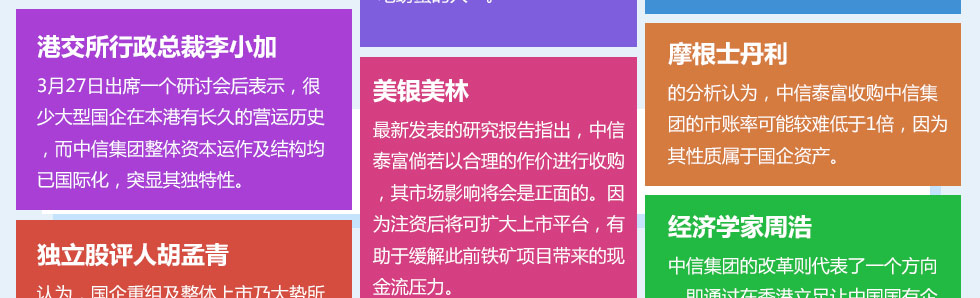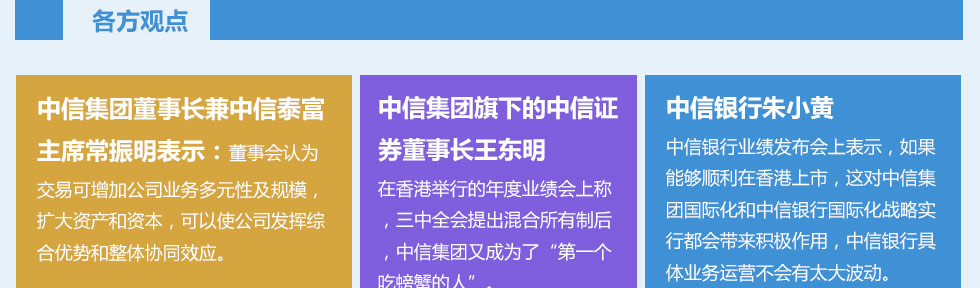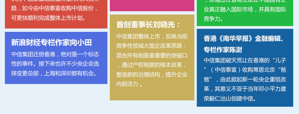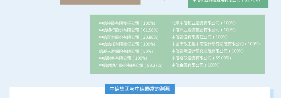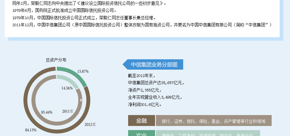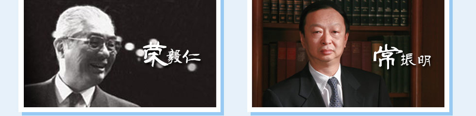 | 榮毅仁:1916年5月生,江蘇無錫人。1957年曾被陳毅副總理譽(yù)為“紅色資本家”。1979年創(chuàng)辦中國國際信托投資公司,開創(chuàng)了中國第一個(gè)對(duì)外開放的窗口。1986年底,被美國《幸福》半月刊評(píng)為世界50名知名企業(yè)家之一,是建國后國內(nèi)企業(yè)家躋身世界知名企業(yè)家行列的第一人。2005年10月26日因病在北京逝世,享年89歲。 | 常振明:1956年10月出生,2011年12月任中國中信集團(tuán)有限公司董事長。高級(jí)經(jīng)濟(jì)師,畢業(yè)于美國紐約保險(xiǎn)學(xué)院工商管理專業(yè),研究生學(xué)歷,工商管理碩士。歷任中信實(shí)業(yè)銀行副行長,中國中信集團(tuán)公司常務(wù)董事、副總經(jīng)理,中國建設(shè)銀行副董事長、行長,中國中信集團(tuán)公司副董事長、總經(jīng)理,董事長。 |