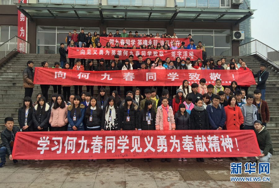 危難時(shí)刻挺身而出,英雄壯舉催人淚下。何九春的同學(xué)們紛紛自發(fā)的打出標(biāo)語,向何九春致敬。
