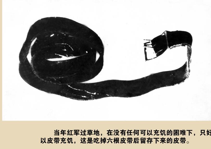 原來(lái),這條皮帶是周廣才在1934年的一次戰(zhàn)斗中繳獲敵人的戰(zhàn)利品。但為了使全班戰(zhàn)友活下來(lái),他只得含淚將皮帶拿出來(lái)。皮帶被切成幾段丟入滾燙的熱水中,煮熟后每人夾起“一截”狼吞虎咽的吃起來(lái)……當(dāng)鍋里還剩最后“一截”時(shí)他哭著說(shuō):“同志們,咱們留著它作個(gè)紀(jì)念吧,帶到延安去見(jiàn)毛主席。”懷著對(duì)革命勝利的無(wú)限渴望,最終他們把這截皮帶留了下來(lái)。