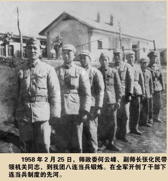 ????1958年8月,毛澤東主席在北戴河召開的中央政治局?jǐn)U大會議上講話指出:“我們的軍官,像云南的一個師長,一年當(dāng)一個月兵,我看這是好辦法?!@樣,我們的軍隊就是永遠(yuǎn)打不散的軍隊?!泵飨谥械膸熼L,實際是當(dāng)時的師政委何云峰,而下連當(dāng)兵的地方便在該團(tuán)三營八連,八連也被譽(yù)為下連當(dāng)兵第一連。