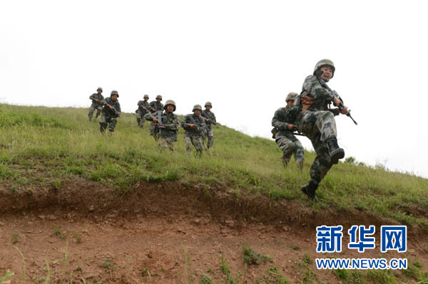 ????陸軍第39集團軍某紅軍旅官兵在演習中發(fā)起沖鋒(2016年5月14日攝)。