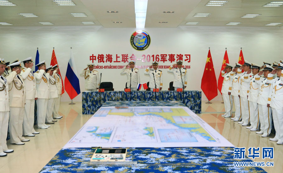 ????9月13日,中俄“海上聯(lián)合—2016”軍事演習(xí)開幕式在演習(xí)導(dǎo)演部舉行,中方總導(dǎo)演、中國(guó)海軍副司令員王海和俄方總導(dǎo)演、俄羅斯海軍副司令費(fèi)多堅(jiān)科夫共同宣布演習(xí)開始。