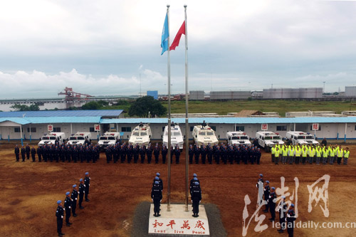 ????利比里亞蒙羅維亞時(shí)間9月25日,中國(guó)第四支駐利比里亞維和警察防暴隊(duì)與駐利比里亞中資企業(yè)員工和華人華僑代表一同舉行“戰(zhàn)地國(guó)旗別樣紅”慶祝國(guó)慶活動(dòng),在中華人民共和國(guó)成立67周年來臨之際,在距離祖國(guó)一萬(wàn)三千公里的維和任務(wù)區(qū)向祖國(guó)致敬。