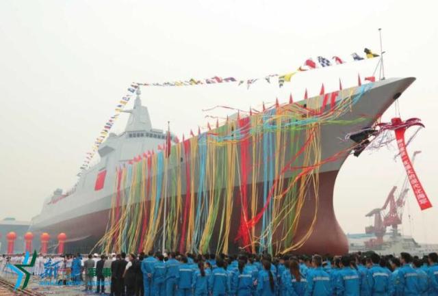 ?。箷r(shí)許,儀式開始,隨著儀式現(xiàn)場(chǎng)全體人員齊聲高唱的國歌聲,鮮艷的五星紅旗冉冉升起。剪彩后進(jìn)行了“擲瓶禮”,一瓶香檳酒在艦艏摔碎,絢麗的彩帶從兩舷噴射而出,新型驅(qū)逐艦鳴響汽笛,全場(chǎng)響起熱烈掌聲。隨后,驅(qū)逐艦在拖曳牽引下緩緩移上浮箱后下水。