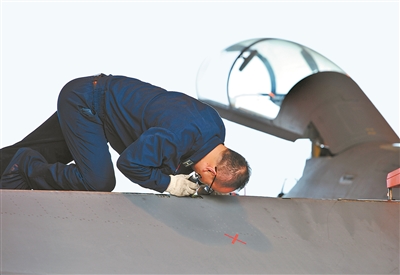 7月7日下午,空軍某飛訓(xùn)基地組織跨晝夜飛行。戰(zhàn)機(jī)歸來后,一名機(jī)械師單膝跪在機(jī)翼上,臉緊貼戰(zhàn)機(jī)縫隙檢查動作筒有無漏油。由于工作需要,機(jī)務(wù)人員經(jīng)常需要彎腰低頭、鉆進(jìn)狹小機(jī)艙,有時(shí)一彎就是小半天,很容易患上腰肌勞損等常見病,但為了讓飛機(jī)不“帶病”上天,這名機(jī)械師把身體彎成了與座艙蓋相似的弧度。徐晨桐、靳翚淇 攝影報(bào)道