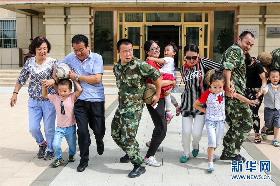 ?7月25日,在新疆邊防總隊(duì)奇臺(tái)邊防大隊(duì),警官與家屬一起玩親子籃球游戲。新華社記者李京 攝