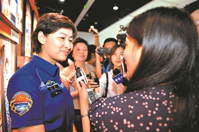 中國(guó)人民解放軍航天員大隊(duì)航天員劉洋在展覽現(xiàn)場(chǎng)接受媒體記者的采訪。本報(bào)記者 宋雯 攝