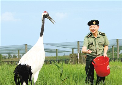 ????駐守在這里的邊防官兵主動承擔起守護濕地生態(tài)、保護野生動物的使命,他們日夜穿梭巡邏在廣袤的濕地。僅今年以來,該所依托“警民義務護鳥隊”、“護鳥熱線”等平臺,組織官兵巡邏踏查保護區(qū)核心區(qū)域120余次,定期向丹頂鶴等各類候鳥投放玉米等飼料。同時,該所深入轄區(qū)向村民宣傳《野生動物保護法》,讓這片土地真正成為候鳥的一片樂土,獲得了保護區(qū)、駐地政府以及當?shù)匕傩盏馁澴u,邊防官兵們被親切地稱作候鳥“守護神”。圖為官兵喂食丹頂鶴。(童瑞金 耿建平)