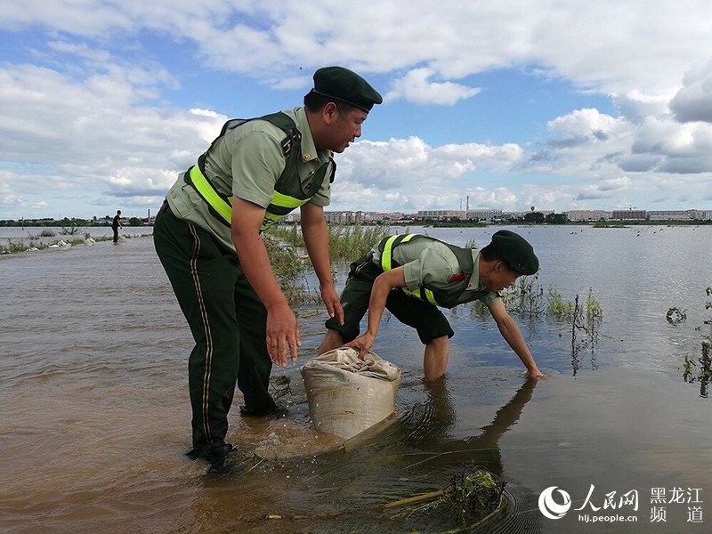 黑龍江省撫遠(yuǎn)市鴨南鄉(xiāng)境內(nèi)河水暴漲淹沒(méi)公路,邊防官兵緊急救援。