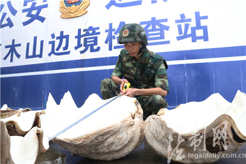 ????8月29日,廣西邊防總隊防城港邊防支隊楠木山邊境檢查站查獲國家一級保護(hù)動物硨磲標(biāo)本3只,總重218公斤。