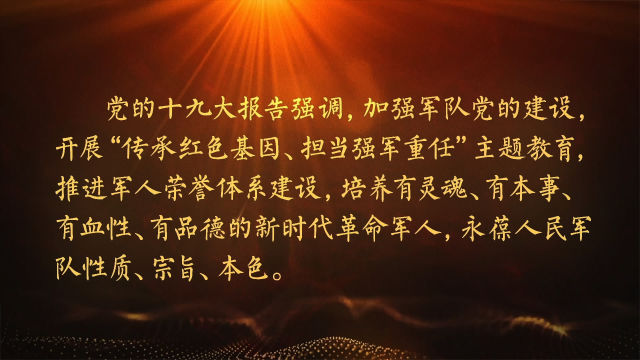 黨的十九大報告強(qiáng)調(diào),加強(qiáng)軍隊(duì)黨的建設(shè),開展“傳承紅色基因、擔(dān)當(dāng)強(qiáng)軍重任”主題教育,推進(jìn)軍人榮譽(yù)體系建設(shè),培養(yǎng)有靈魂、有本事、有血性、有品德的新時代革命軍人,永葆人民軍隊(duì)性質(zhì)、宗旨、本色。