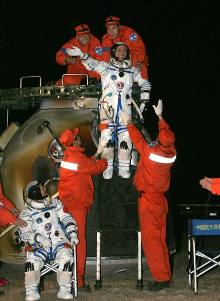 ????2008年9月28日,神舟七號(hào)返回地球,航天員翟志剛、劉伯明、景海鵬(從左至右)自主出艙后向現(xiàn)場搜救人員揮手致意。新華社記者 王建民 攝