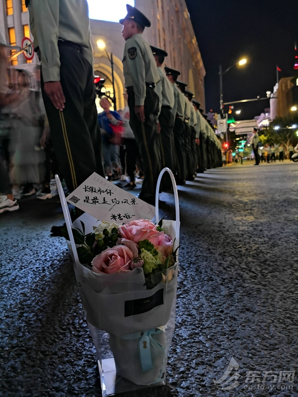 10月4日晚21時(shí)10分,在南京路步行街十字路口,一位姑娘手捧鮮花走執(zhí)勤官兵面前:“辛苦你們,這束花送給你們!”放下轉(zhuǎn)身便消失在人群之中。當(dāng)執(zhí)勤官兵拿起鮮花時(shí)驚喜地發(fā)現(xiàn),里面還夾了一張?zhí)刂频拿餍牌?,娟秀的字跡寫到:“長(zhǎng)假和你,是最美麗的風(fēng)景。辛苦啦~比心~”