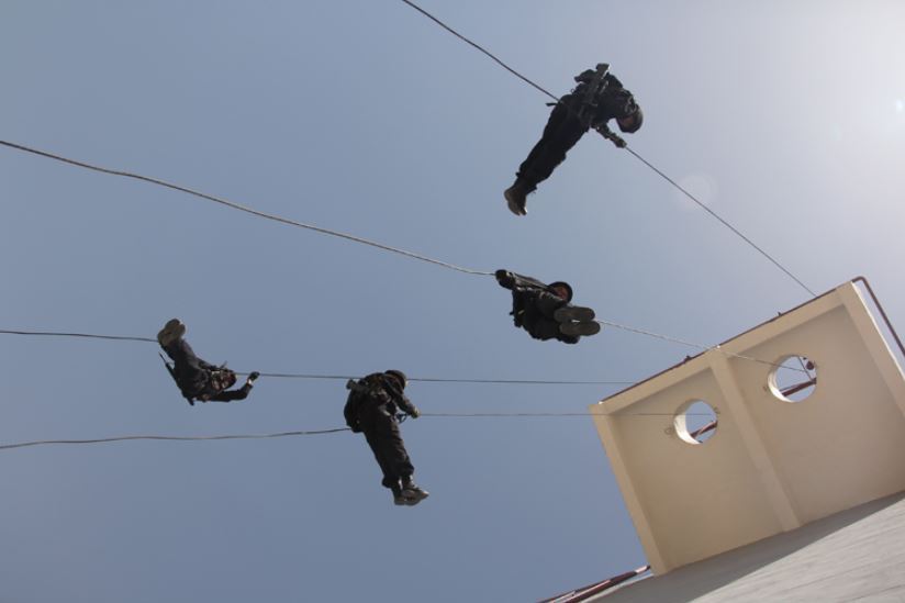 ????資料圖片:武警新疆總隊四支隊特勤中隊進行樓房索降訓練。新華社發(fā)(楊皓 攝)
