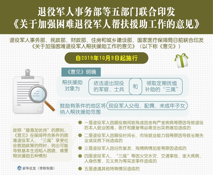 新華社北京10月21日電(記者梅世雄)退役軍人事務(wù)部、民政部、財(cái)政部、住房和城鄉(xiāng)建設(shè)部、國(guó)家醫(yī)療保障局日前聯(lián)合印發(fā)《關(guān)于加強(qiáng)困難退役軍人幫扶援助工作的意見(jiàn)》(以下稱《意見(jiàn)》),自2019年10月9日起施行。