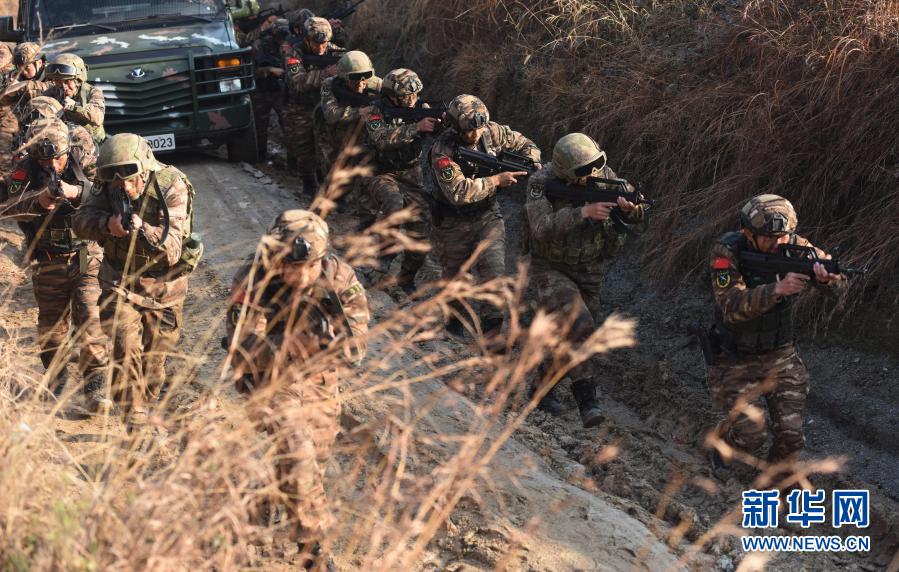 武警安徽總隊(duì)某特戰(zhàn)分隊(duì)與陸軍某旅防空營在皖東腹地開展戰(zhàn)術(shù)訓(xùn)練交流(12月6日攝)。新華社發(fā)(徐偉 攝)