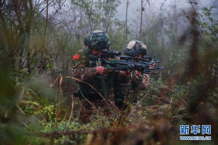 武警貴州總隊(duì)六盤水支隊(duì)特戰(zhàn)隊(duì)員在山林地捕殲戰(zhàn)斗中用弓弩射擊(12月10日攝)。新華社發(fā)(康夫?qū)?攝)