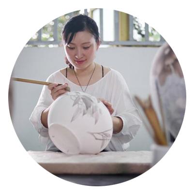 我從小就很喜歡繪畫,大學(xué)的時(shí)候認(rèn)識(shí)了我的先生,他帶我去了醴陵。當(dāng)時(shí)我看到幾個(gè)小女孩拿毛筆在瓶子上細(xì)細(xì)地勾線,我很喜歡她們這種狀態(tài),想著自己也可以嘗試一下。父親也很鼓勵(lì)我,想讓我從事這方面的工作,所以常常帶我去寫生,慢慢地我就愛(ài)上了這門技藝。我們醴陵瓷傳統(tǒng)的核心工藝是分水,父親在傳統(tǒng)工藝中總結(jié)出“薄施淡染”技法,主要表現(xiàn)對(duì)象是花卉,它能使花卉層次更加豐富、水靈通透,體現(xiàn)醴陵瓷清雅淡逸、意態(tài)高潔的陶瓷語(yǔ)言,所以我們現(xiàn)在的創(chuàng)作仍然以花卉為主,而這次在清華的學(xué)習(xí),讓我拓寬了許多思路,我想在山水和其他物象中嘗試去用我們工藝來(lái)表現(xiàn),希望今后能給觀者帶來(lái)一些新的感受。
