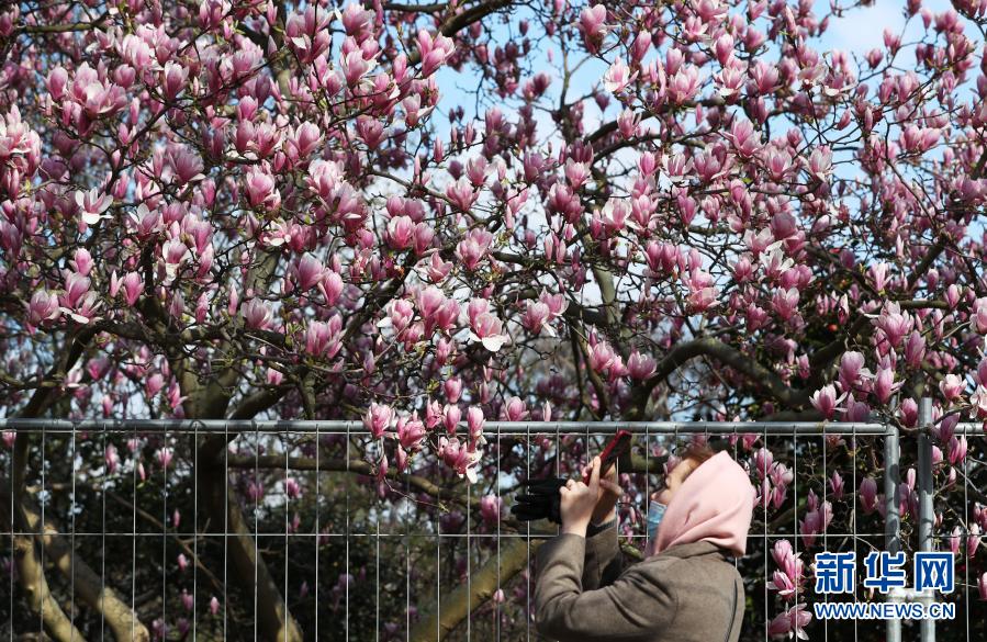 3月19日,在法國(guó)巴黎埃菲爾鐵塔腳下的戰(zhàn)神廣場(chǎng),一名女子拍攝玉蘭花。新華社記者高靜攝