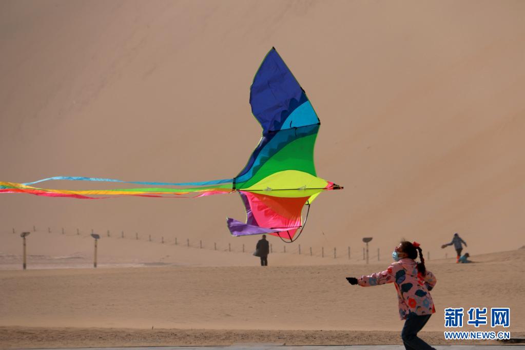 4月5日,小朋友在甘肅省敦煌市鳴沙山月牙泉景區(qū)山門(mén)廣場(chǎng)放風(fēng)箏。