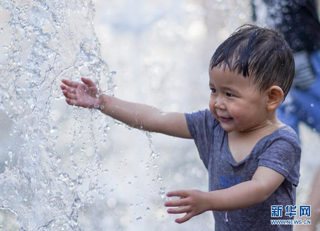 6月20日,小朋友在北京華熙LIVE·五棵松商業(yè)街區(qū)一處噴泉戲水。