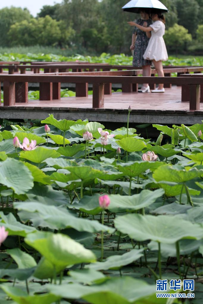 6月21日,在山東省濱州市博興縣麻大湖國(guó)家濕地公園百畝荷塘,游客在觀(guān)賞荷花。