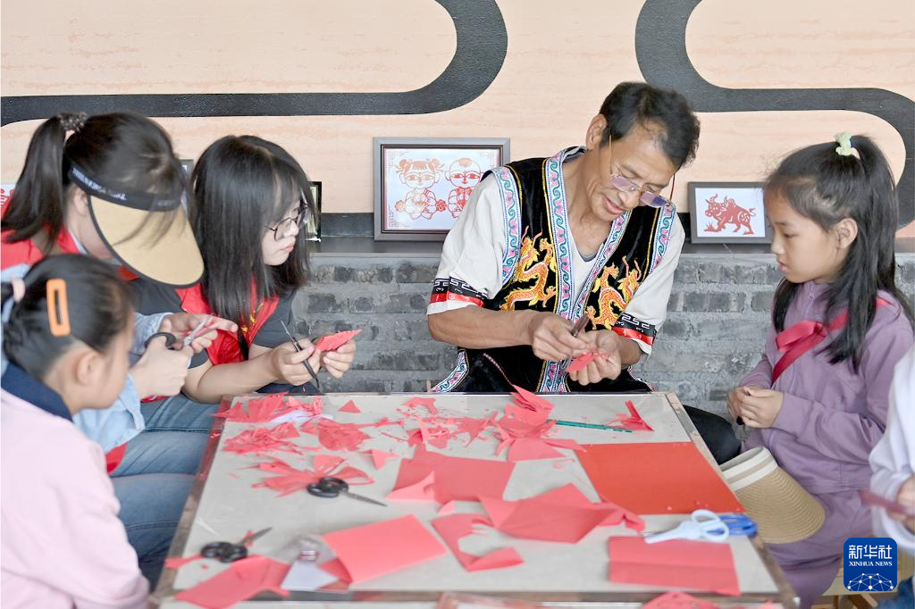 5月2日,小朋友在南涧县南涧镇西山村幸福小院内学习剪纸。