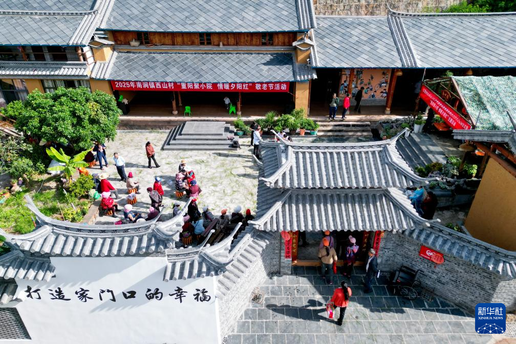 10月29日,老人在南涧县南涧镇西山村幸福小院内准备参加重阳节活动(无人机照片)。