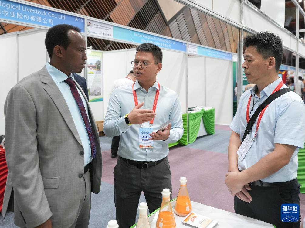 10月28日,在肯尼亚首都内罗毕举行的2025非洲国际农业博览会上,展商向来宾介绍产品。