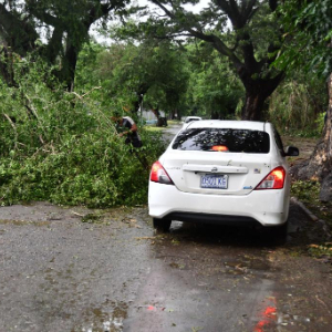 10月28日,在牙买加首都金斯敦,一名男子在飓风过境后清理树枝。