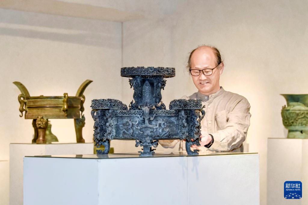 10月27日,郑东平在位于铜陵市的工作室展厅内查看自己复制的青铜器作品。