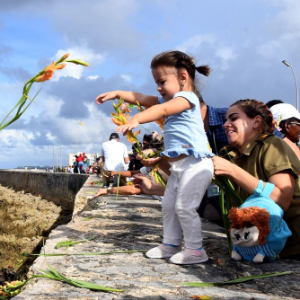 10月28日,在古巴首都哈瓦那海滨大道,一名小女孩在家人的陪伴下向海中抛撒鲜花,纪念古巴革命英雄卡米洛·西恩富戈斯遇难66周年。