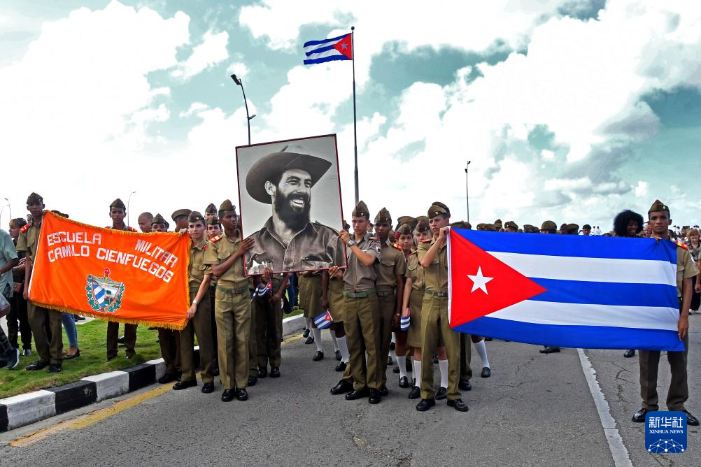 10月28日,在古巴首都哈瓦那,军事院校学员手持古巴革命英雄卡米洛·西恩富戈斯的肖像参加纪念活动。