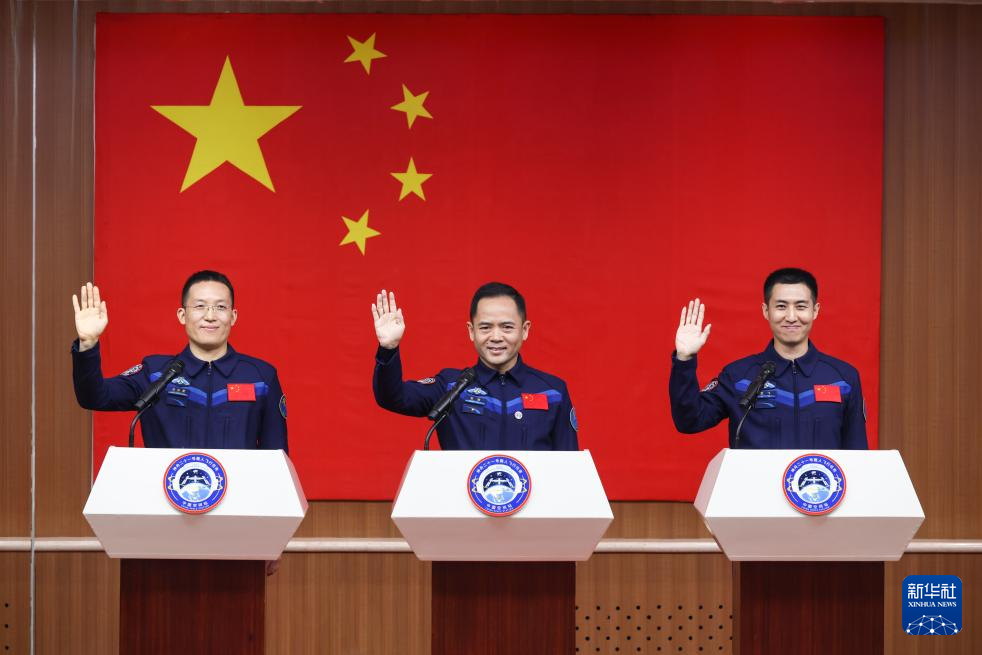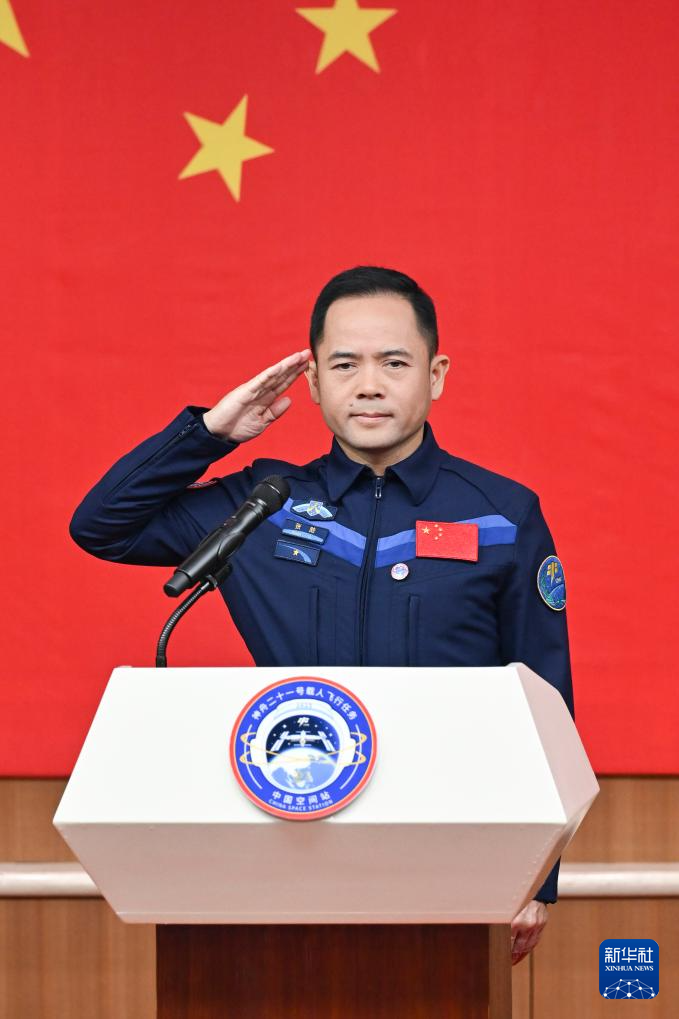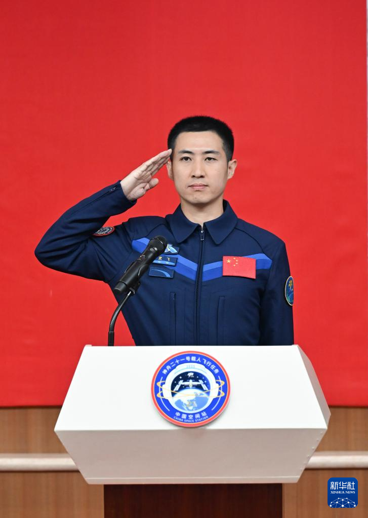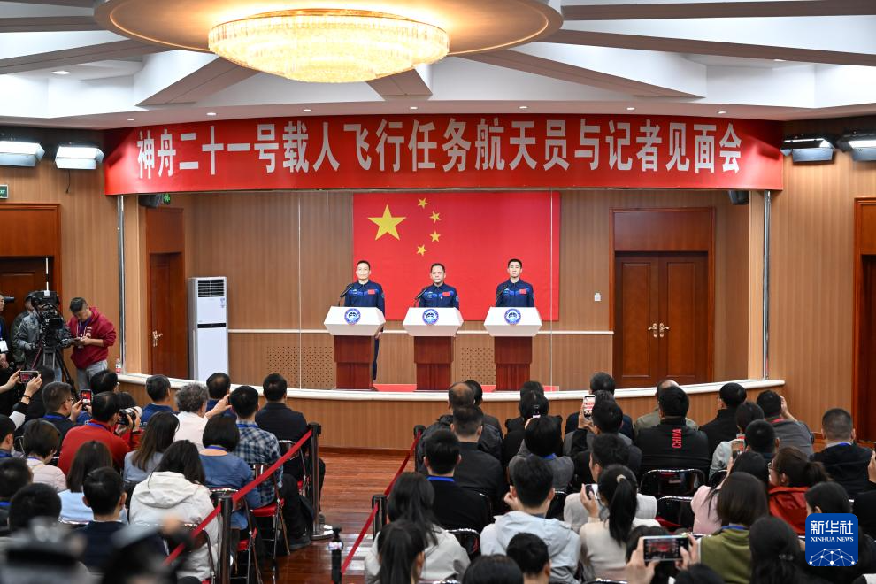 10月30日,神舟二十一号载人飞行任务航天员张陆(中)、武飞(右)、张洪章在酒泉卫星发射中心问天阁与媒体记者集体见面。