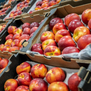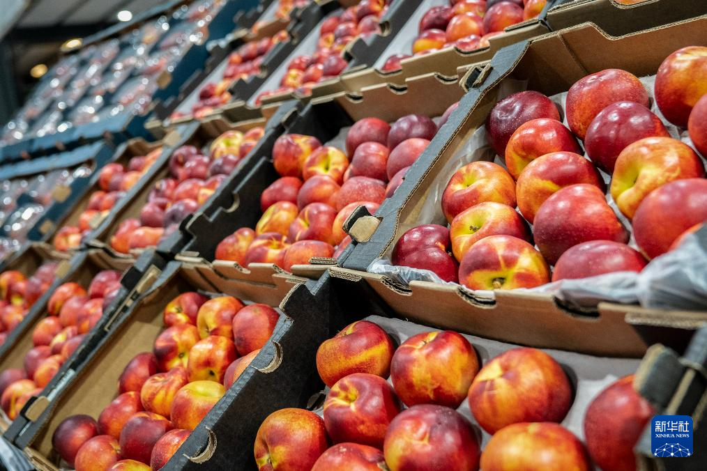 10月29日,在南非约翰内斯堡生鲜产品市场,一盒盒油桃整齐地摆放在货架上。