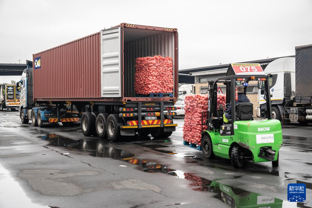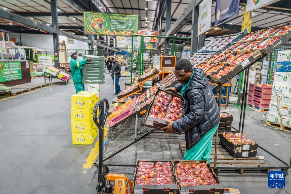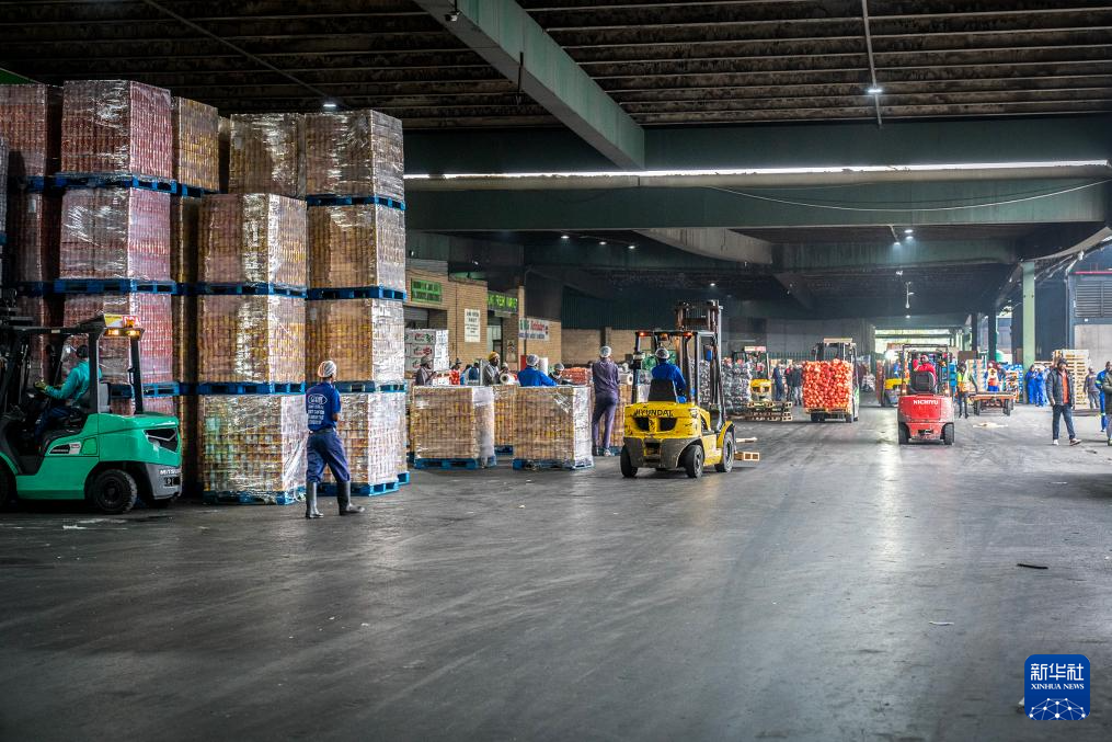 10月29日,在南非约翰内斯堡生鲜产品市场,工作人员使用叉车将核果运上货车。