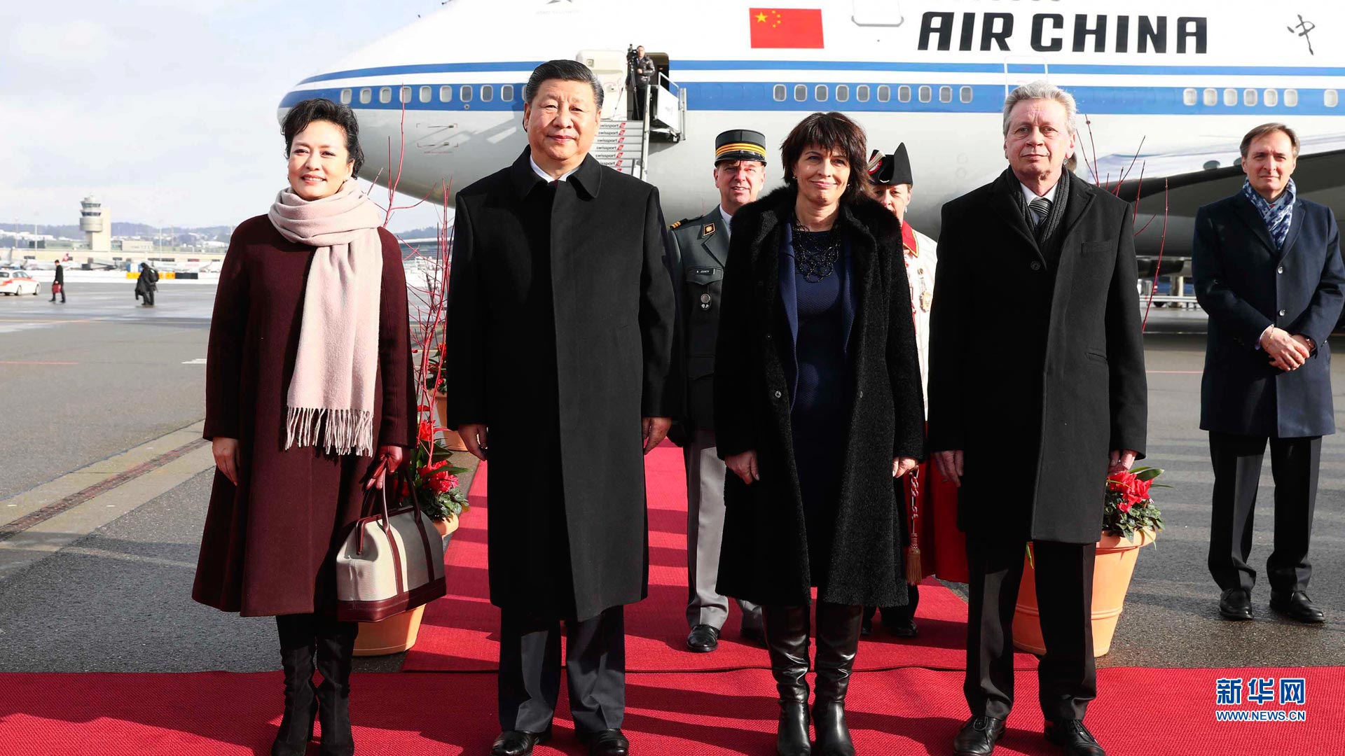 1月15日,國(guó)家主席習(xí)近平乘專機(jī)抵達(dá)蘇黎世,開始對(duì)瑞士聯(lián)邦進(jìn)行國(guó)事訪問。這是瑞士聯(lián)邦主席洛伊特哈德在機(jī)場(chǎng)為習(xí)近平和夫人彭麗媛舉行隆重歡迎儀式。新華社記者蘭紅光攝2017-01-16