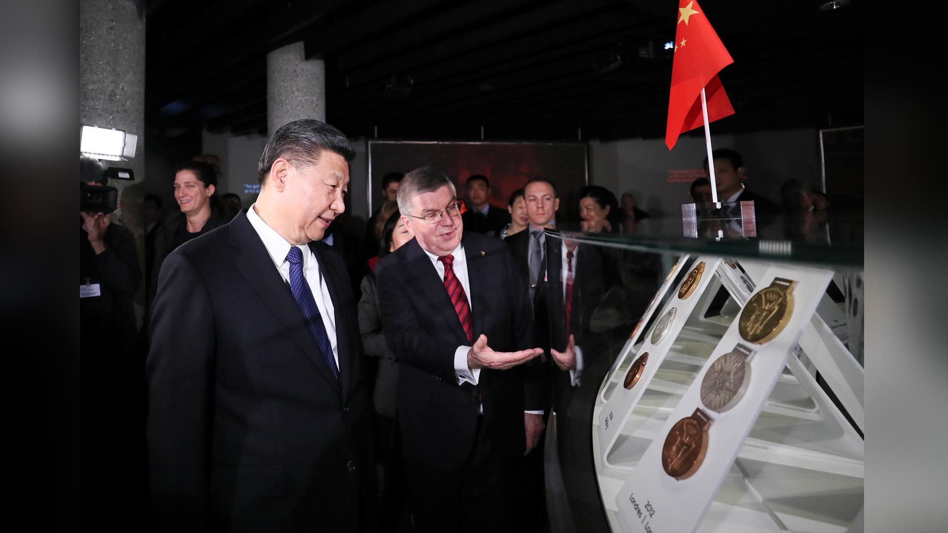 1月18日,國(guó)家主席習(xí)近平在瑞士洛桑國(guó)際奧林匹克博物館會(huì)見國(guó)際奧林匹克委員會(huì)主席巴赫。這是會(huì)見后,習(xí)近平在巴赫陪同下參觀往屆奧運(yùn)會(huì)獎(jiǎng)牌展。新華社記者 蘭紅光 攝2017-01-19