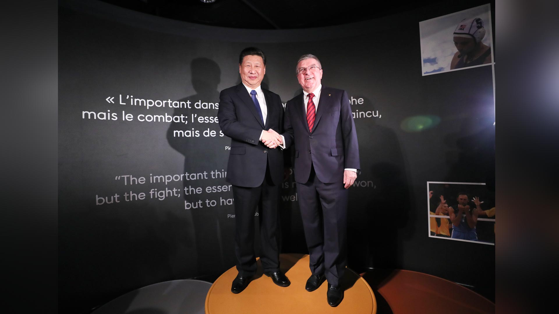 1月18日,國(guó)家主席習(xí)近平在瑞士洛桑國(guó)際奧林匹克博物館會(huì)見國(guó)際奧林匹克委員會(huì)主席巴赫。這是習(xí)近平和巴赫在奧運(yùn)冠軍領(lǐng)獎(jiǎng)臺(tái)上合影。新華社記者 蘭紅光 攝2017-01-19