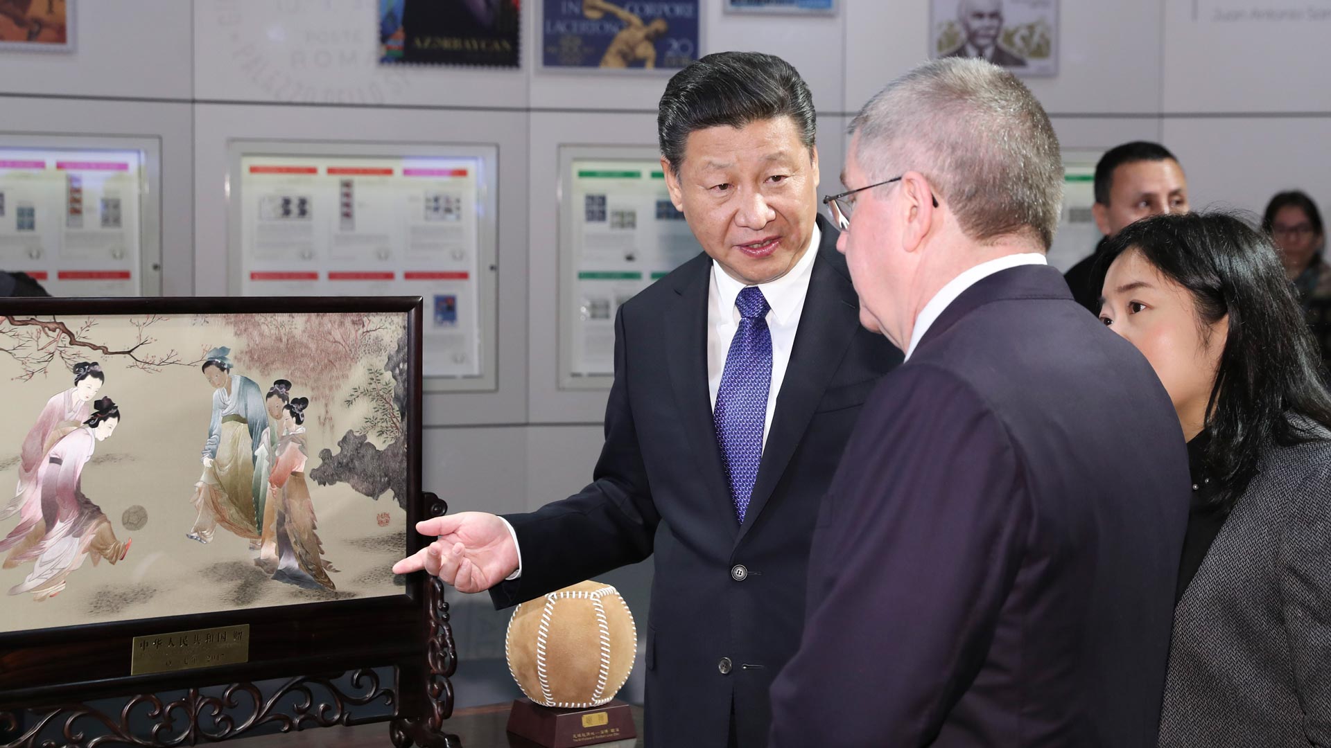 1月18日,國(guó)家主席習(xí)近平在瑞士洛桑國(guó)際奧林匹克博物館會(huì)見國(guó)際奧林匹克委員會(huì)主席巴赫。這是習(xí)近平向巴赫介紹中華人民共和國(guó)贈(zèng)送給國(guó)際奧林匹克委員會(huì)的蘇繡《仕女蹴鞠圖》。新華社記者 丁林 攝2017-01-19