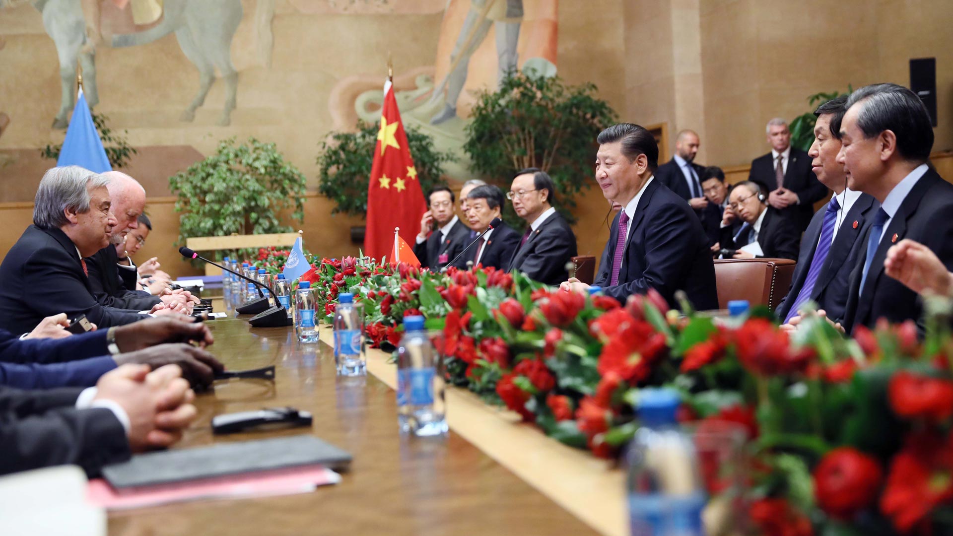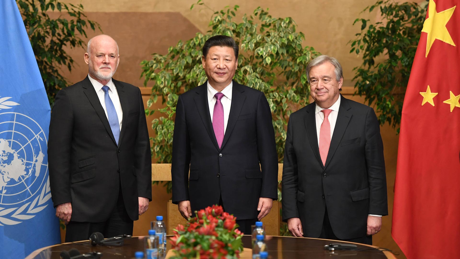 1月18日,國(guó)家主席習(xí)近平在瑞士日內(nèi)瓦萬國(guó)宮會(huì)見第71屆聯(lián)合國(guó)大會(huì)主席湯姆森和聯(lián)合國(guó)秘書長(zhǎng)古特雷斯。 新華社記者 蘭紅光 攝2017-01-19