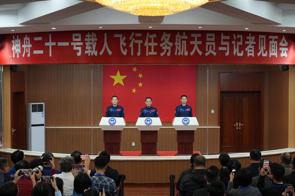 10月30日,神舟二十一号载人飞行任务航天员张陆(中)、武飞(右)、张洪章在酒泉卫星发射中心问天阁与媒体记者集体见面。