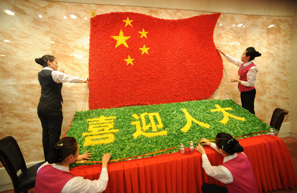 3月2日,京西賓館的服務員用絹花拼出國旗和“喜迎人大”的圖案。當日,為了迎接全國人大代表入住,京西賓館的服務員自發(fā)設計,并從市場上采購來絹花,在餐廳拼出組合圖案,表達“喜迎人大”的心情。