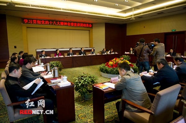 11月28日,黨的十八大精神湖南省委宣講團(tuán)正式成立,12月5日起至2013年元月底,宣講團(tuán)將赴長沙、各市州、省直單位、高等院校和大型企業(yè)開講,并將在紅網(wǎng)等網(wǎng)站開展網(wǎng)上視頻宣講。湖南省委常委、省委宣傳部部長許又聲出席動員會并講話。