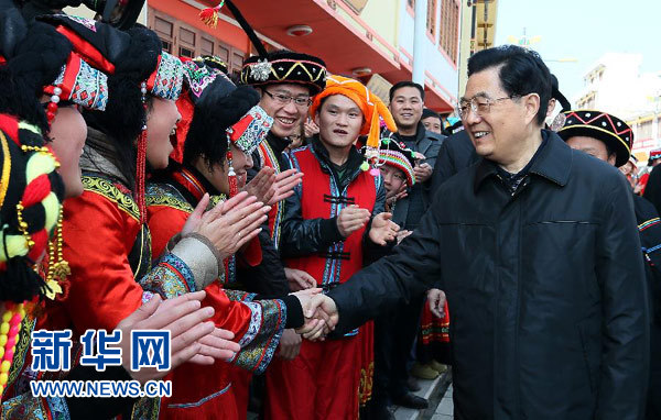 ????12月1日至6日,國(guó)家主席胡錦濤在貴州考察工作。這是胡錦濤在畢節(jié)市普底彝族小鎮(zhèn)向各族群眾親切致意。 新華社記者 鞠鵬 攝
