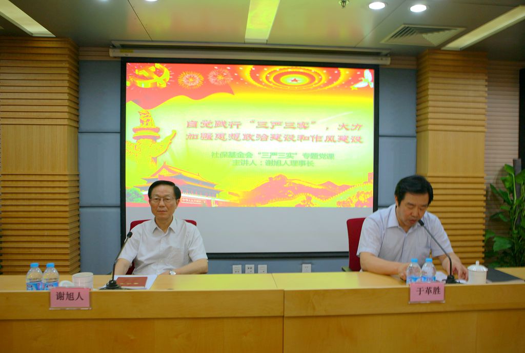 5月25日下午,全國社會(huì)保障基金理事會(huì)謝旭人理事長(zhǎng)為全體干部職工講授了題為“自覺踐行三嚴(yán)三實(shí),大力加強(qiáng)思想政治建設(shè)和作風(fēng)建設(shè)”的專題黨課,同時(shí)對(duì)開展“三嚴(yán)三實(shí)”專題教育進(jìn)行了動(dòng)員。于革勝副理事長(zhǎng)主持會(huì)議,中央組織部干部四局張晨光同志應(yīng)邀參加。