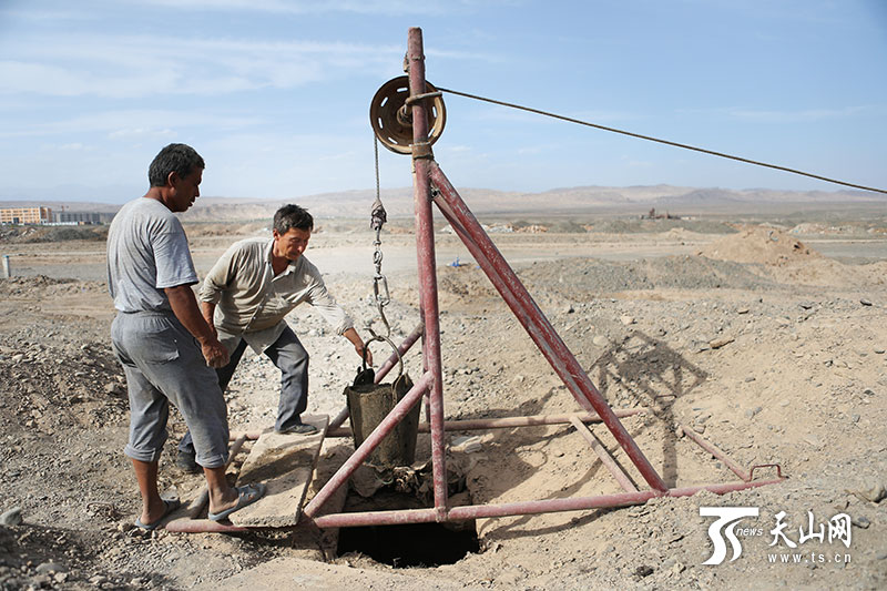 每天早上9點,庫爾班·司馬義準時到豎井旁開始工作,中午僅有一個小時的吃飯時間。在并不寬敞的豎井里一上一下,庫爾班原本白色的衣服上一片一片的黑印。天氣酷熱難耐,庫爾班·司馬義只是擦擦汗,看著喊熱的我們,眼睛笑成了一條縫兒,看到有人試圖到井邊去,他連忙提醒小心。