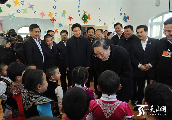 俞正聲仔細(xì)聽取新村牧民定居建設(shè)情況介紹,走進(jìn)新村幼兒園送上益智玩具等幼教器具,觀看教學(xué)點(diǎn)雙語(yǔ)教學(xué),與小朋友們一起拍手唱兒歌《小兔兒乖乖》,聽二年級(jí)學(xué)生朗誦童謠《我的家鄉(xiāng)也拉曼》,氣氛幸福溫暖。