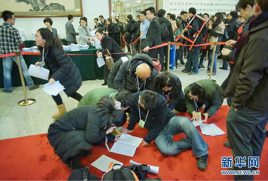 ??? 3月5日,第十二屆全國人民代表大會第三次會議在北京人民大會堂開幕。這是記者在人民大會堂內(nèi)領(lǐng)到政府工作報告后抓緊閱讀。