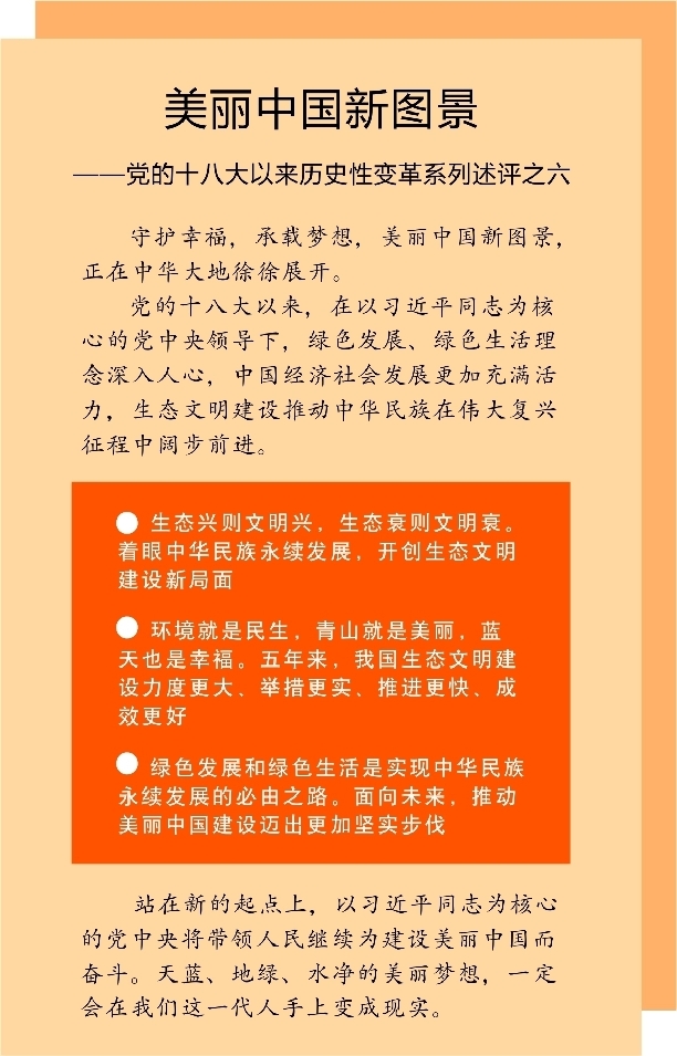 站在新的起點(diǎn)上,以習(xí)近平同志為核心的黨中央將帶領(lǐng)人民繼續(xù)為建設(shè)美麗中國(guó)而奮斗。天藍(lán)、地綠、水凈的美麗夢(mèng)想,一定會(huì)在我們這一代人手上變成現(xiàn)實(shí)。